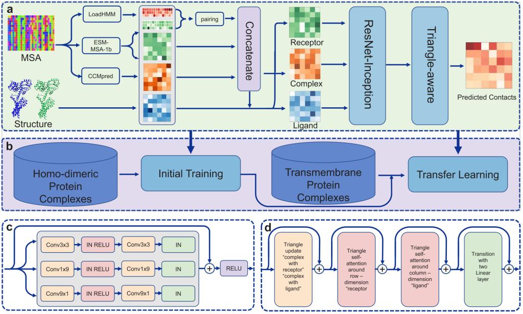 膜蛋白在生命细胞中扮演着许多不同且重要的功能,人类基因中大约有四分之一参与编码膜蛋白。膜蛋白链间的残基接触信息对于预测膜蛋白复合物结构有着至关重要的作用,并且对理解膜蛋白的相互作用分子机制有着重要价值。目前,大部分的方法致力于研究可溶单体和复合物蛋白的相互作用残基接触预测。由于膜蛋白其复杂的周边环境与可溶蛋白质存在较大的不同,现有的方法在膜蛋白复合物的链间接触预测上的准确率还有待提升。另外,由于实验测定跨膜蛋白复合物的困难,现有数据库中实验解析出的非冗余跨膜蛋白复合物数量仍然稀缺。因此,迫切需要提出新的方法来预测跨膜蛋白的链间相互作用,进而确定其复合物结构和理解其生物学功能。