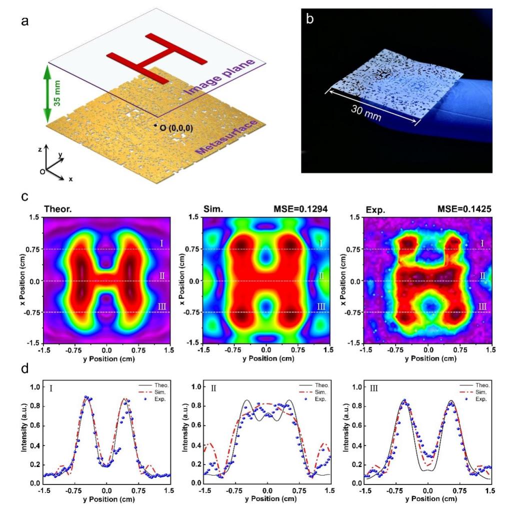 图2:剪裁加工的非局域全息超透镜及其复杂全息声场