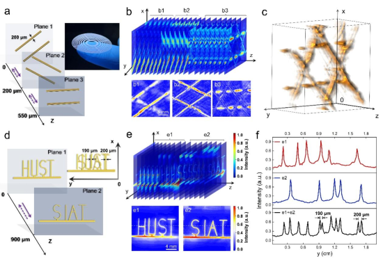 图3:剪裁加工的成像超透镜及其远场高分辨二维、三维超声脉冲-回波成像
