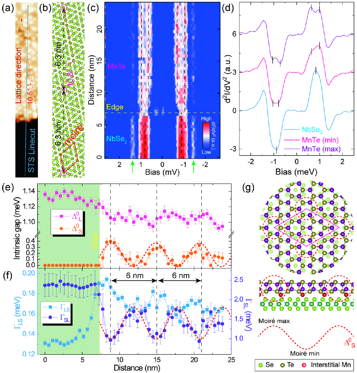 图2MnTe/NbSe2异质结的双带超导增强和实空间周期调制,及其莫尔晶格模型示意图。