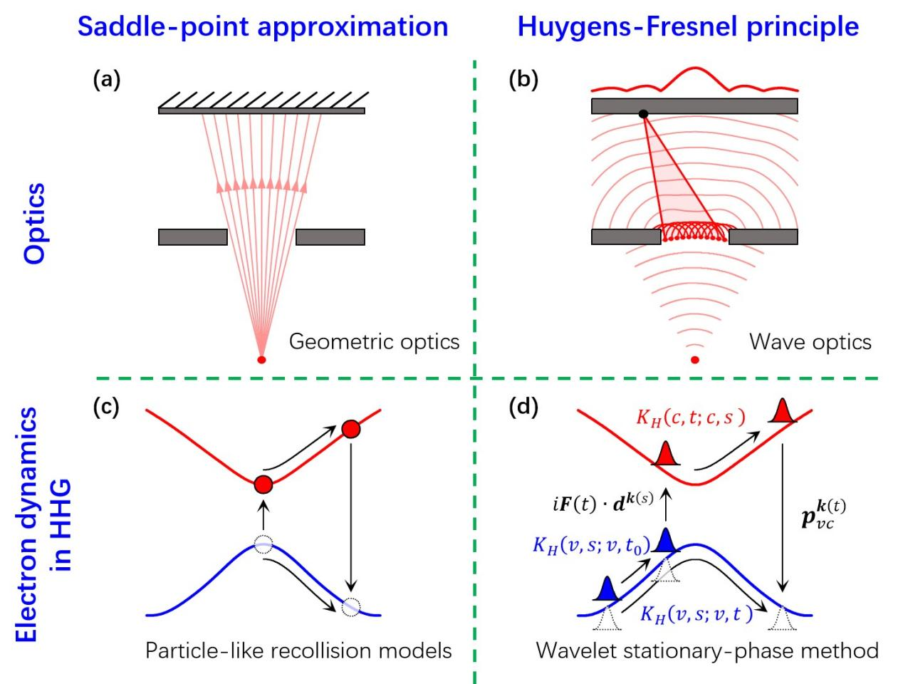 固体阿秒物理是一个快速发展的领域,随着所涉及的激光参数及材料体系的扩展,它的研究范围及影响领域也在迅速扩大。在此前的工作中,人们通常采用粒子性的再碰撞图像描述固体高次谐波产生过程。在这些模型中,人们通常需要假定电子具有局域特性。然而,考虑到固体中电子具有明显的非定域性及复杂的能带结构,粒子性再碰撞模型在定量描述固体高次谐波产生过程时仍然存在很多问题。在最近的工作中,从波动的观点出发,我们提出了固体高次谐波产生的惠更斯-菲涅尔图像。此时,电子运动由一系列小波而非经典粒子来描述,高次谐波辐射被解释为所有小波贡献的相干叠加。这为正在迅速兴起的固体阿秒物理的研究提供了一种新的范式和思路。