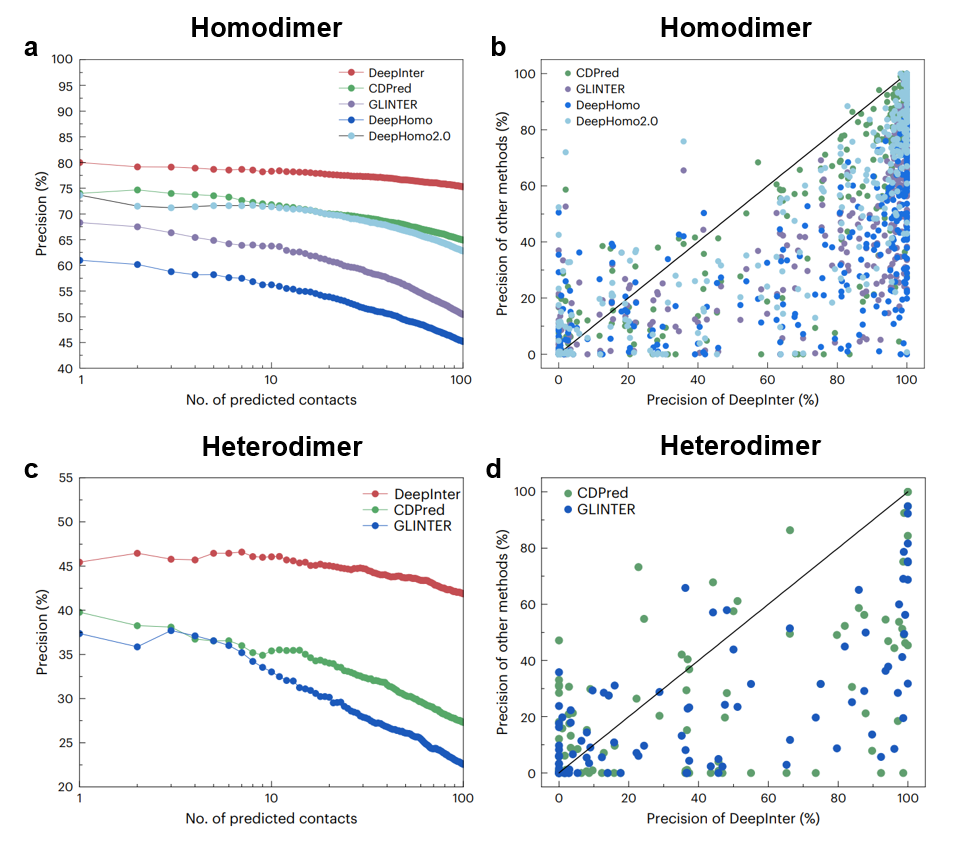 为了解决这一问题,黄胜友教授课题组提出了一种基于几何三角感知和蛋白质语言模型的蛋白质复合物链间接触预测方法-DeepInter。DeepInter设计了受体、配体、复合物三个分支路线的网络流程,以及独特的蛋白质间三角感知模块来有效提升二聚体复合物中链间接触预测的准确率和鲁棒性,同时能够减小预测的链间接触图中违背几何约束的数量。首先,DeepInter通过搜索受体和配体的多序列比对信息,并通过系统发育学的序列配对方法来构建复合物的多序列比对。其次,DeepInter利用先进的蛋白质语言模型分别提取了单体和复合物的序列表征和隐含的共进化模式。之后,DeeInter通过ResNet-Inception模块将输入特征编码到高维的潜空间,并通过Triangle-aware模块来同时考虑蛋白质内部和蛋白质之间的氨基酸对距离信息来驱使网络模型能够自动识别几何约束信息。通过在同源二聚体和异源二聚体的测试集对DeepInter进行全面的评估,并与其它主流的复合物接触预测算法进行比较。结果表明,DeepInter在不同的测试集上均展现出更高的准确率和鲁棒性。此外,随着考虑的预测链间接触对数量增加,DeepInter准确率相对其他方法来说更具稳定性(即下降曲率更低),说明我们提出的Triangle-aware模块能更好的捕捉全局相互作用,并减少其中的几何冲突。进一步地,DeepInter还在多序列深度,接触密度,构象变化,固有无序蛋白和结构相似度等多个影响因子上进行全面的分析和比较,表明我们方法相较其它方法具备更好的鲁棒性。