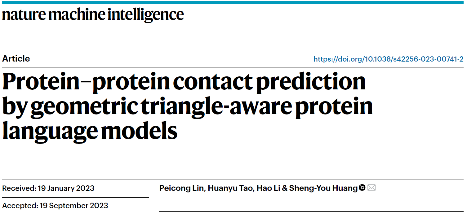 10月19日,公司生物物理团队黄胜友教授课题组在蛋白质-蛋白质相互作用预测领域取得重要进展,相关成果发表于《自然·机器智能》(Nature Machine Intelligence),题目为《基于几何三角感知和蛋白质语言模型的蛋白质-蛋白质接触预测》(Protein-protein contact prediction by geometric triangle-aware protein language models)。304永利集团为唯一通讯单位,公司博士生林培聪为论文第一作者,博士生陶环宇和李豪为共同作者,黄胜友教授为通讯作者。