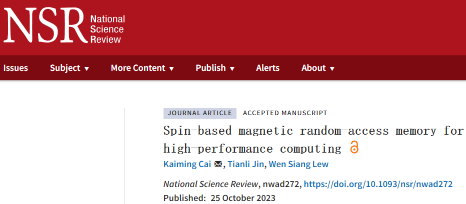 10月25日,《国家科学评论》(NationalScienceReview)在线发表了公司交叉学科中心蔡凯明教授和国际同行关于高性能自旋磁性存储器的观点文章,文章题目为“Spin-based magnetic random-access memory for high-performance computing”,304永利集团蔡凯明教授是文章的第一作者兼通讯作者。研究工作得到国家自然科学基金委项目支持。