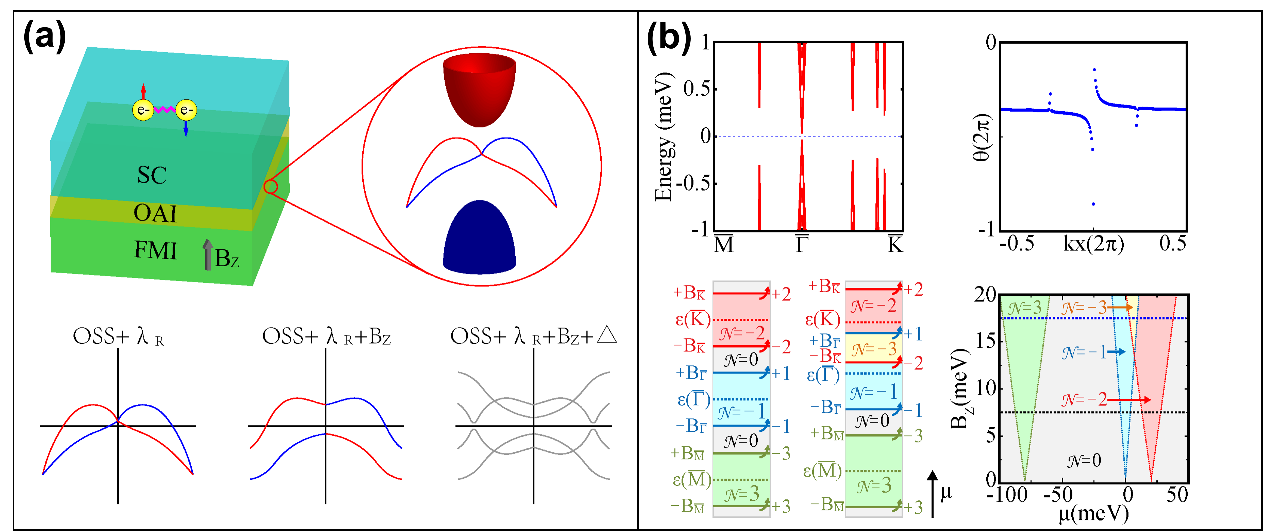实现拓扑超导(TSC)和马约拉纳态(MSs)是基础物理和拓扑量子计算中最重要和最具挑战性的任务之一。由于本征的拓扑超导体(p波超导体)十分稀少,过去十几年中,人们提出了许多在拓扑绝缘体、具有Rashba自旋轨道耦合的半导体或磁性原子链的表面或界面利用s波超导体的近邻效应诱导拓扑超导的异质结方案。其中,半导体-s波超导体异质结方案受到了广泛关注并在实验上取得了重要进展。随着研究的深入,该方案也遭遇了两个重大的困难和挑战:一、半导体中普遍存在的多重子带问题。这个问题不仅使得TSC相更难调控实现,也会产生许多平庸的低能态与MS混淆。二、半导体中较小的Rashba自旋轨道耦合会影响超导相在塞曼场中的稳定性,增加了实验难度。