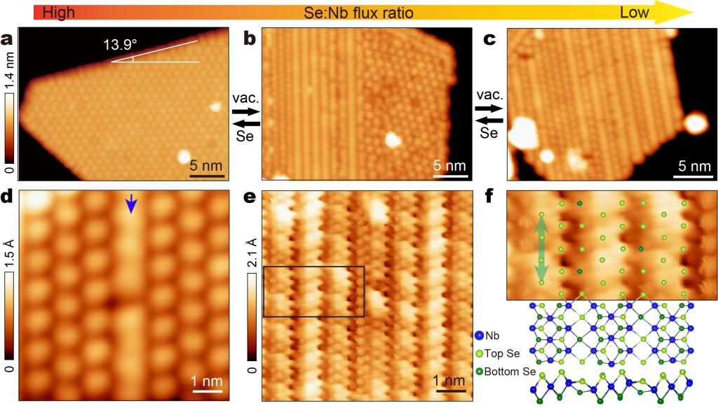 图1:单层条纹相1T-NbSe2的生长过程及结构示意图。
