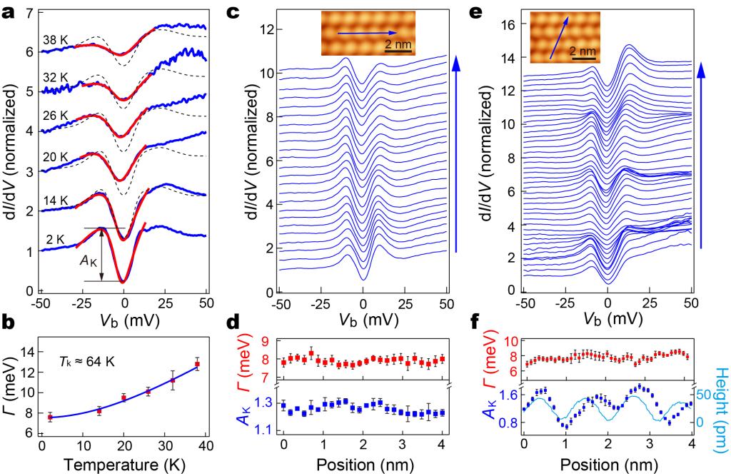 图2:近藤共振扫描隧道谱的变温及空间分布表征。