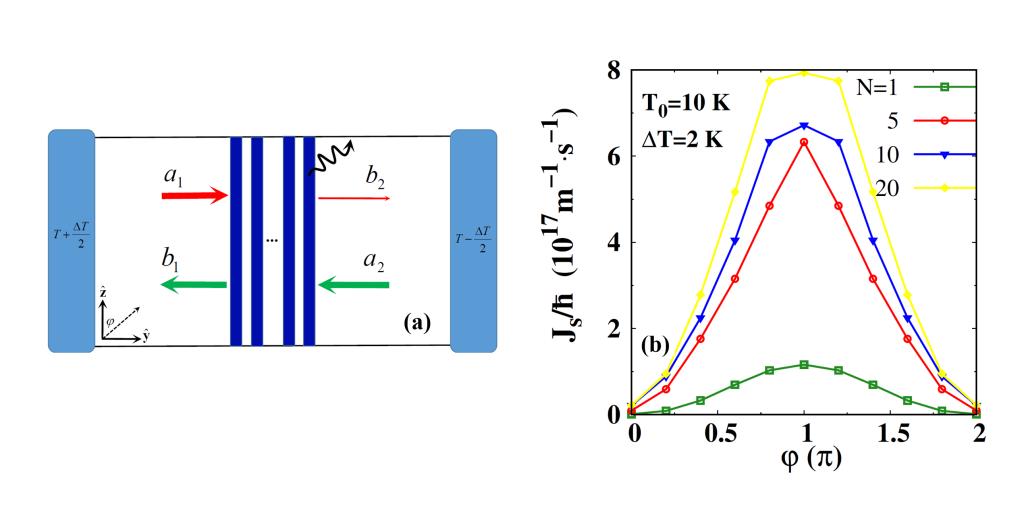 通过手性相互作用,磁子只能和某个方向传播的另一种准粒子相互耦合。在线性响应时,手性相互作用引起“相干”磁子的非互易输运。然而,手性常常与整流效应或二极管效应相混淆,而后者都是严格的非线性现象。在本文中,我们探索了在线性响应时磁子热流能否被栅极调控从而实现自旋晶体管这一问题。我们发现在源极和漏极之间磁子的热流可以被磁性纳米线组成的栅极有效调制。该栅极选择性地耗散沿一个方向传播的磁子,但对沿相反方向传播的磁子没有影响,如图1(a)所示。我们预测了一个令人惊讶且与直觉相反的效应: 当相互作用不是手性时,从源极和漏极无法向栅极注入净磁子热流,但是打开手性后会产生一个非常可观的从源到栅极的净磁子热流,从而对栅极自旋磁矩提供一个由磁子导致的自旋力矩,如图1(b)所示。这种横向热自旋泵浦效应可以通过旋转薄膜磁化来控制,并可能有助于调控未来磁子电路中的热流。