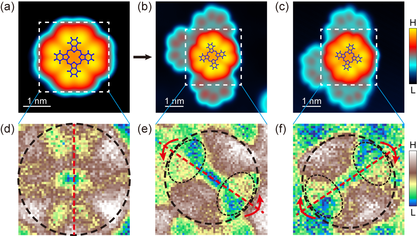 团队推测分子的手性是Tb2Pc3与邻近分子之间相互作用引起的。通过使用STM针尖操纵分子分离和结合,研究人员发现分离出来的单个Tb2Pc3没有手性,但可以通过分子操纵构建TbPc2和Tb2Pc3的分子多聚体重现手性(图2),证实分子间相互作用驱动Tb2Pc3产生了手性。