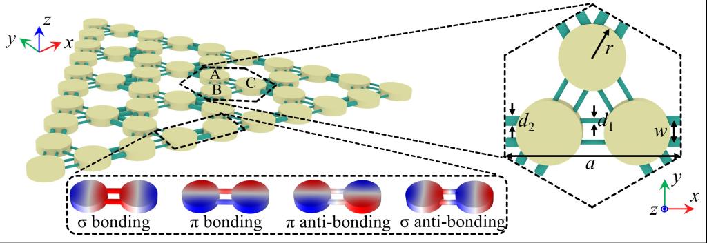 拓扑相所揭示的有趣的电子和波输运特性,在量子电路、光子学和声学等领域展现出了广阔的应用前景。在凝聚态物理中,除了自旋和电荷之外,轨道自由度在关联电子和固态材料等体系中,对新的拓扑相揭示有着重要作用,例如轨道超流体和拓扑半金属等。近年来,轨道模式相关的拓扑物理探索已扩展到光子学和电子学等领域。例如,利用耦合微柱阵列构建的光子蜂窝晶格实现了轨道模式相关的边界态和Type-II/Type-III型狄拉克锥等。然而,当前对声高阶拓扑的研究主要聚焦在支持单自由度的s轨道模式,而支持多轨道自由度的高阶拓扑物理尚未在声学系统中得到广泛的探索。