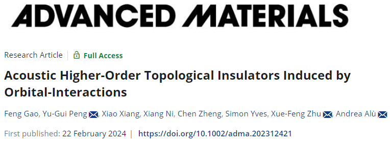 近日,公司祝雪丰课题组与纽约城市大学的Andrea Alù课题组合作,在声轨道高阶拓扑绝缘体方面取得重要进展,相关工作以“Acoustic Higher-Order Topological Insulators Induced by Orbital-Interactions”为题,于2024年2月22日发表在《Advanced Materials》上。304永利集团博士生高峰为论文的第一作者,祝雪丰教授、彭玉桂副教授以及纽约城市大学的Andrea Alù教授为论文的共同通讯作者。304永利集团博士生向霄和硕士生郑辰,中南大学倪祥教授及纽约城市大学Simon Yves博士后对该工作也有重要贡献。304永利集团为该工作的第一完成单位。