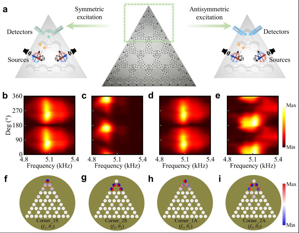为实验验证轨道模式相互作用诱导的多类型声高阶角态,研究团队通过金属加工制备了图2所示的实验样品。在实验中,为了有效地激发轨道角态,研究团队使用了两组偶极声源。如图2所示,哑铃代表偶极声源,红(蓝)色表示相位0 (π),旋转箭头表示测量时的声源旋转方向。在对称和反对称激励下,基于不同的源偏振和频率组合,可在Kagome晶格边角处选择性激发四种高阶拓扑角态。