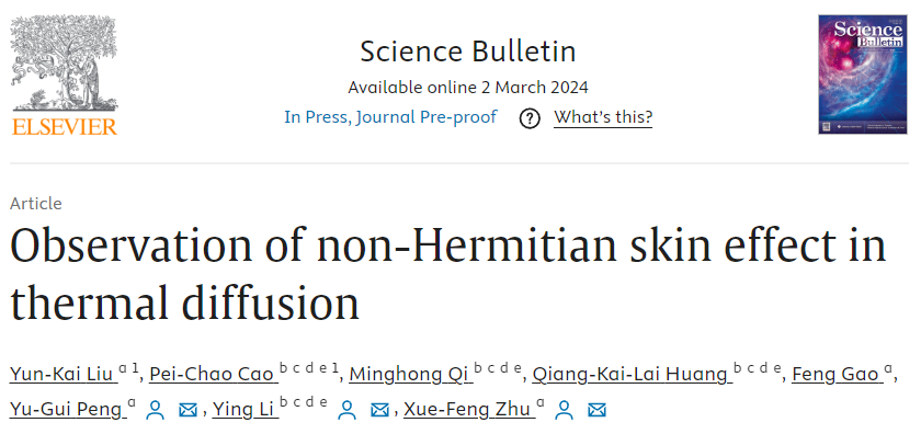 近日,公司祝雪丰教授课题组与浙江大学的李鹰研究员课题组合作,在热扩散体系非厄米趋肤效应方面取得重要进展,相关工作以“Observation of non-Hermitian skin effect in thermal diffusion”为题,于2024年3月2日在线发表在《Science Bulletin》上。304永利集团博士生刘云开和浙江大学博士后曹培超为论文的第一作者,祝雪丰教授、彭玉桂副教授以及浙江大学李鹰研究员为论文的共同通讯作者。304永利集团博士生高峰,浙江大学博士生祁铭鸿、黄强开来对该工作也有重要贡献。304永利集团为该工作的第一完成单位。