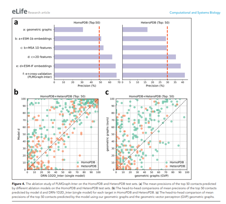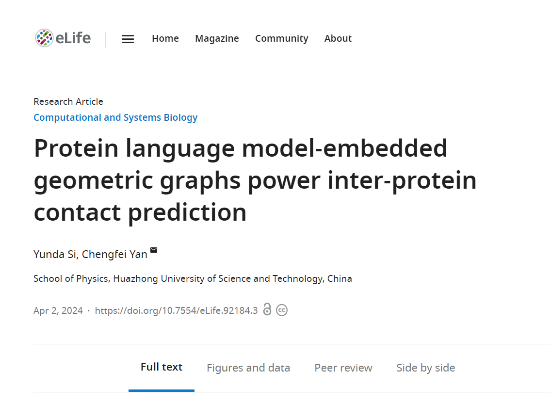 近日,公司生物物理团队闫成飞副教授课题组在蛋白质互作预测研究上取得进展,相关工作以“蛋白质语言模型嵌入几何图助力蛋白质互作残基接触预测(Protein language model-embedded geometric graphs power inter-protein contact prediction)”为题,于4月2日在生命科学综合性期刊eLife上发表(https://elifesciences.org/articles/92184)。304永利集团博士生司运达(已毕业)为论文第一作者,闫成飞副教授为通讯作者,304永利集团为该工作的唯一完成单位。