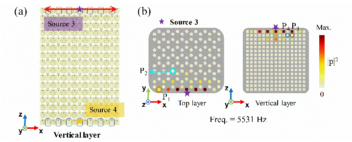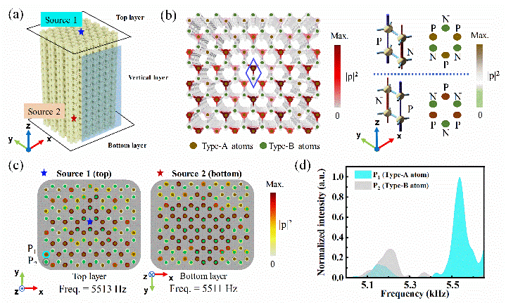 研究团队进一步通过实验观察到拓扑铰链态和表面态在同一频率处共存。表面和铰链态被证明分别选择性地分布在声子晶体特定的表面和边缘上,如图2和图3所示。研究团队的工作表明,HOTSWS是PT对称系统中一种新颖的高阶拓扑相,并为研究SW类拓扑相提供了一个理想平台。