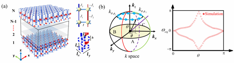 图1展示了研究团队HOTSWS的声学模型。声学结构由六边形声学谐振器和耦合管组成的声子晶体,其中蓝色和红色耦合管分别表示正耦合和负耦合。研究团队通过Wilson loop的方法去计算二阶SW不变量:在第一BZ的k点处定义一个球体,其包裹着一个节点环。蓝色箭头(N波矢量)在k空间中以固定的方位角标记圆环,右图的Wilson loop谱表明w2= 1.