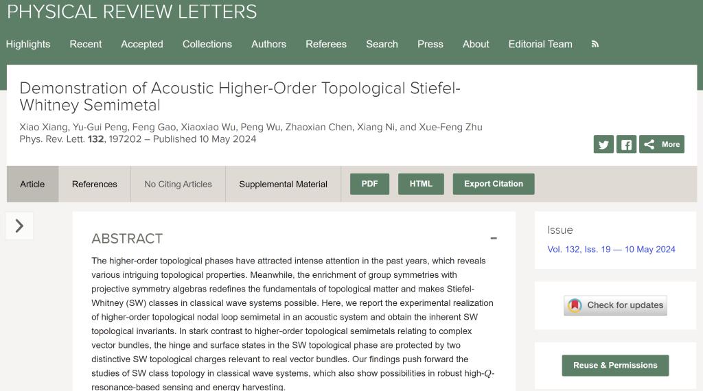 该研究获得了国家自然学科基金的资助。祝雪丰教授团队长期从事拓扑声学的研究,已经在Floquet声拓扑(Nat. Commun. 2016, 7, 13368),单向声绝热演化(Phys. Rev. Lett. 2019, 122(9), 094501;Nat. Commun.2024,15, 1478),Chern类声拓扑(Phys. Rev. Lett. 2019, 014302)和声轨道模式拓扑(Nat. Commun.2024,15, 1478;Adv. Mater. 2024, 2312421)等方面取得了系列成果,详细工作可关注课题组网站http://acoustics-lab.hust.edu.cn/index.htm.