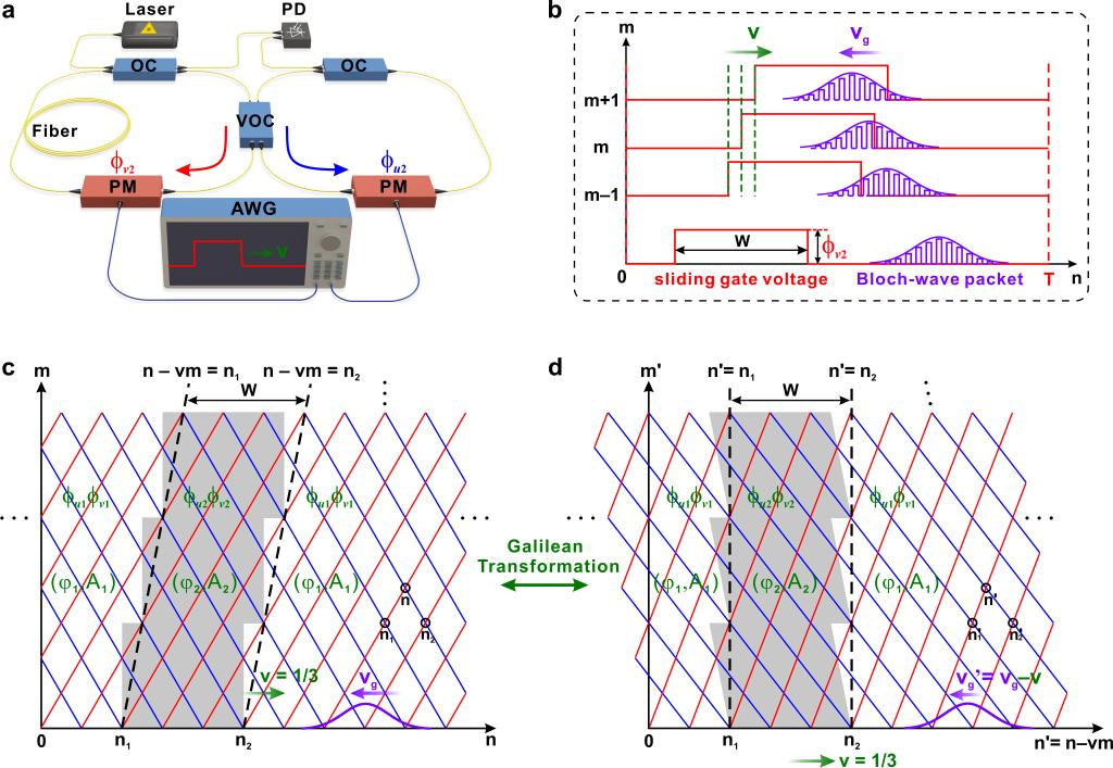 图1.a耦合长-短双光纤环路示意图;b移动门电压信号构造移动矩形势垒示意图;c,d实验室参考系和移动参考系中的离散时域晶格和势垒分布示意图;两种参考系通过伽利略变换相互转换。
