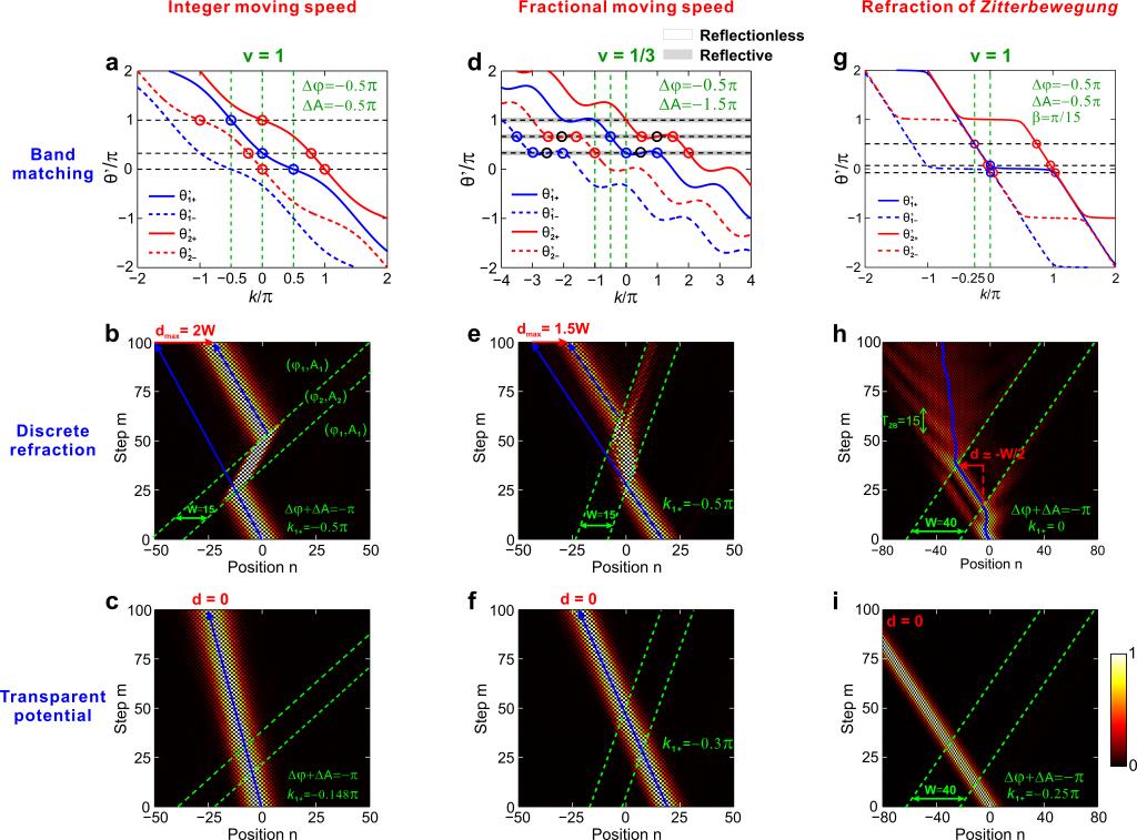 图2.a-c整数移动速度v= 1情形。a移动参考系中势垒内外能带匹配图,蓝(红)线表示势垒外(内)能带,实(虚)线表示+(-)能带支,蓝(红)圈表示入射和折射模式。b,c无反射折射和透明势垒(无折射无反射)情形的光束演化图。d-f分数移动速度v= 1/3的能带匹配图、有反射折射和透明势垒的光束演化图。g-i相对论极限下的狄拉克震颤效应(Zitterbewegung)的折射对应的能带匹配图、离散折射和透明势垒光束演化图。