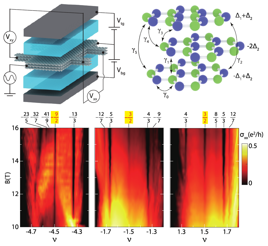 当电子被束缚在二维平面上并置于强磁场中时,它们形成朗道能级,如果相互作用很强则可以产生分数量子霍尔效应。此类物态具有丰富的物理性质,特别是存在分数化元激发,在过去四十年中一直是凝聚态物理研究的重点之一。自从石墨烯发现以来,对其中量子霍尔效应的研究取得了众多成果。王雷教授在这一方向积累了十多年的经验,回国工作以来指导研究生开展了进一步探索。在本项工作中,他们制备了高质量的Bernal堆叠三层石墨烯,并且成功观测到一系列分数量子霍尔态,而此前的研究则未能提供清晰的实验证据。三层石墨烯的朗道能级具有丰富的结构,在外加电磁场中呈现复杂的混合和交叉,为调控分数量子霍尔态创造了有利条件。