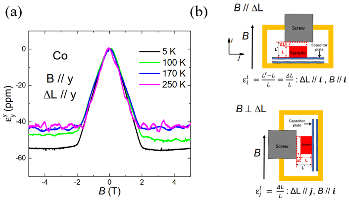 图1 (a)钴单晶的磁致伸缩效应;(b)纵向及横向磁致伸缩测量装置示意图。
