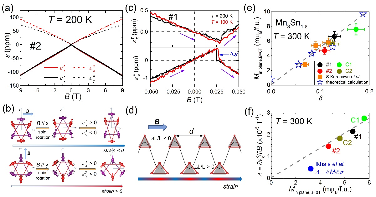 图2(a) Mn3Sn的线性磁致伸缩效应;(b)磁场诱导晶格发生扭曲;(c)磁致伸缩的不连续跃变现象;(d)磁扭曲条纹;(e)自发磁化强度与Sn空位浓度的依赖关系;(f)线性磁致伸缩系数与自发磁化强度的依赖关系。