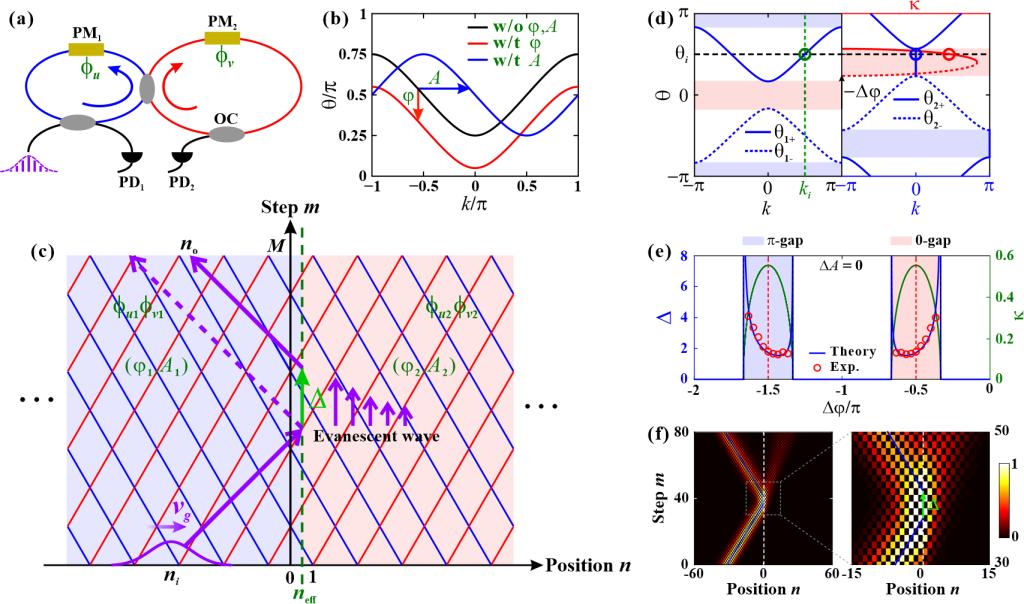 图1. (a)耦合双光纤环路示意图;(b)标势和矢势作用示意图:能分别引起能带上下和左右平移;(c)时域异质晶格示意图,绿色箭头表示时域全反射沿界面的古斯-汉森位移;(d)左右晶格能带匹配图;(e)古斯-汉森位移随相对标势差的变化关系;(f)时域波包反射光场演化图,绿色箭头表示古斯-汉森位移。
