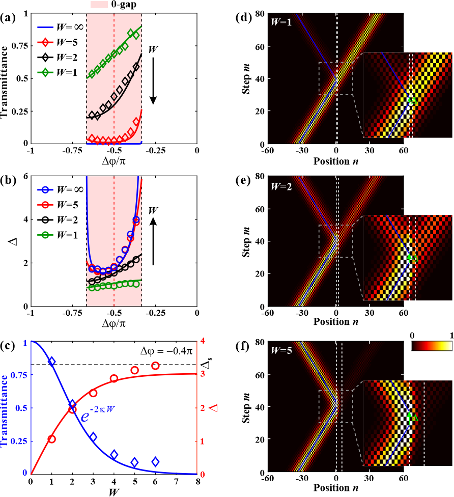 图2. (a)不同势垒宽度下透过率随相对标势差的变化关系;(b)不同势垒宽度下古斯-汉森位移随相对标势差的变化关系;(c)特定标势差下透过率和古斯-汉森位移随势垒宽度的变化关系;(d)(e)(f)势垒宽度分别为W= 1, 2, 5时的波包光场演化图。