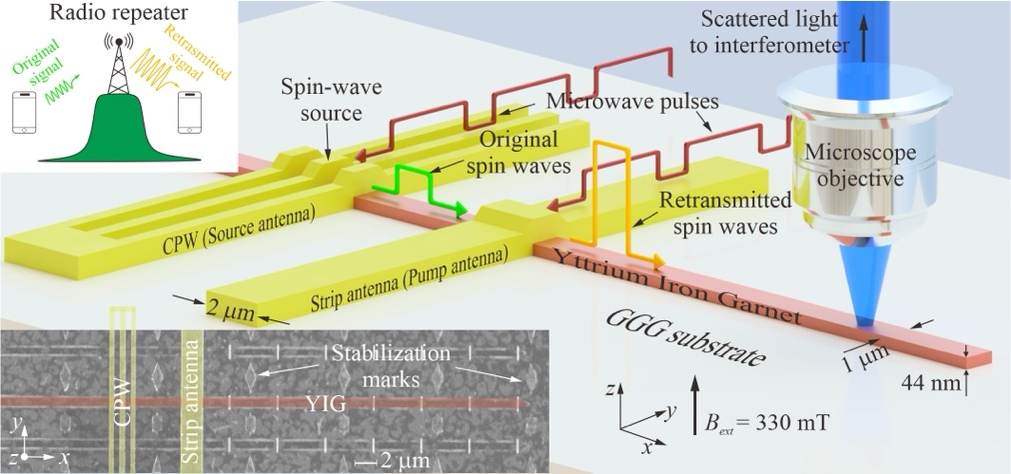 中继器是信号接收器和发射器的组合,可接收信号并进行转发,从而使信号覆盖更长的距离。信号塔是日常生活中常见的中继器,它可以用以接受微弱的手机信号、处理信号、以更大的功率重新发射信号以便让原本不在视距传播范围内的手机进行通信。最近,王棋教授课题组基于自旋波的双稳态理论,制备了微纳尺度的钇铁石榴石自旋波波导。通过磁子在双稳态之间的切换,实现了磁子中继器。其工作原理如图1所示,当入射自旋波到达中继器时,中继器将发射与之同频了的强度更大的自旋波,同时新发射自旋波的强度与和相位与入射自旋波强调相位无关,因此磁子中继器起到了“净化“和放大自旋波信号的功能,为全磁子集成电路的实现提供了又一关键元件。