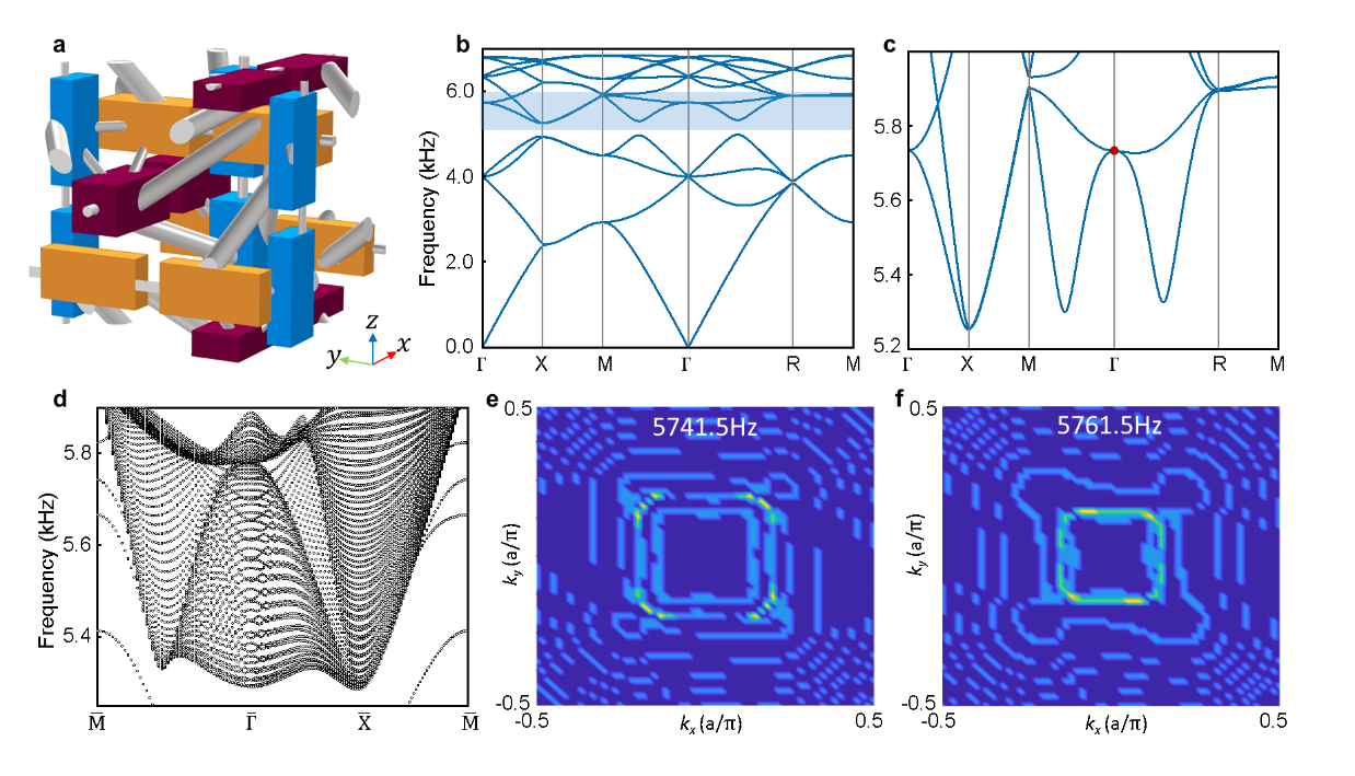 图3:(a)001方向扩胞沿0.4M−Γ−0.4Mʹ路径的能带;(b)实空间的最大声压分布;(c)-(f)对应不同k点不同频率下的声压分布。表面态不同扇叶将出现在不同空间位置,形成不同的、独立的拓扑输运通道。