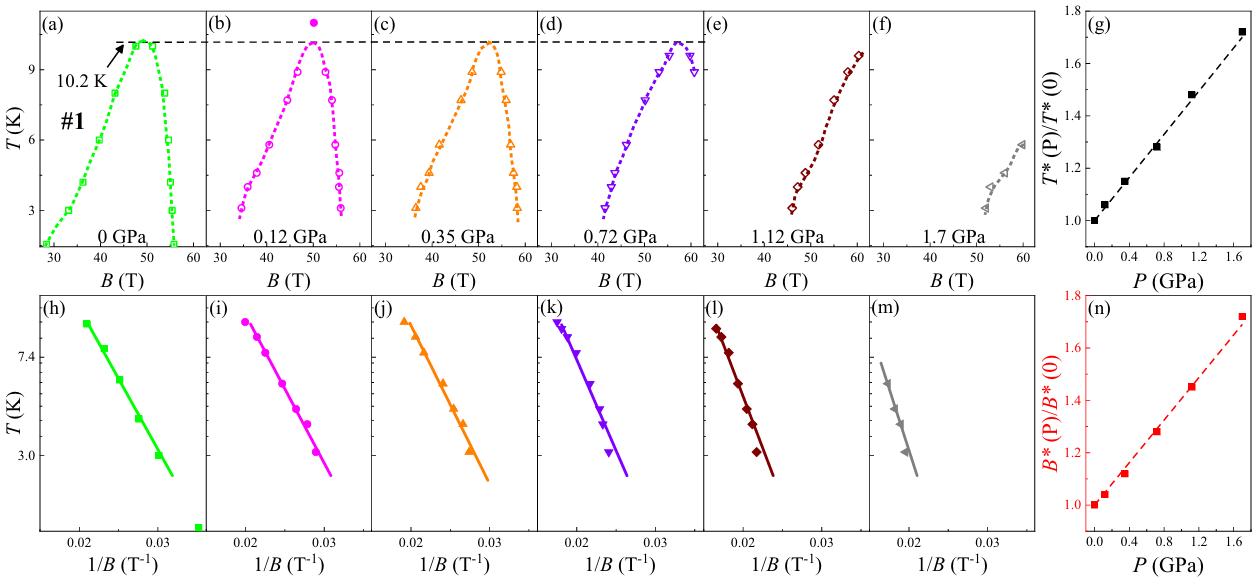图2石墨在不同压力下的T-B相图(a)-(f)和T-1/B相图(h)-(m),(g)、(n)拟合参数T*和B*的压力依赖性。