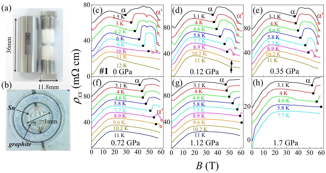 图1 (a)、(b)为压力包装置,(c)-(h)为石墨在不同压力下的磁电阻率。