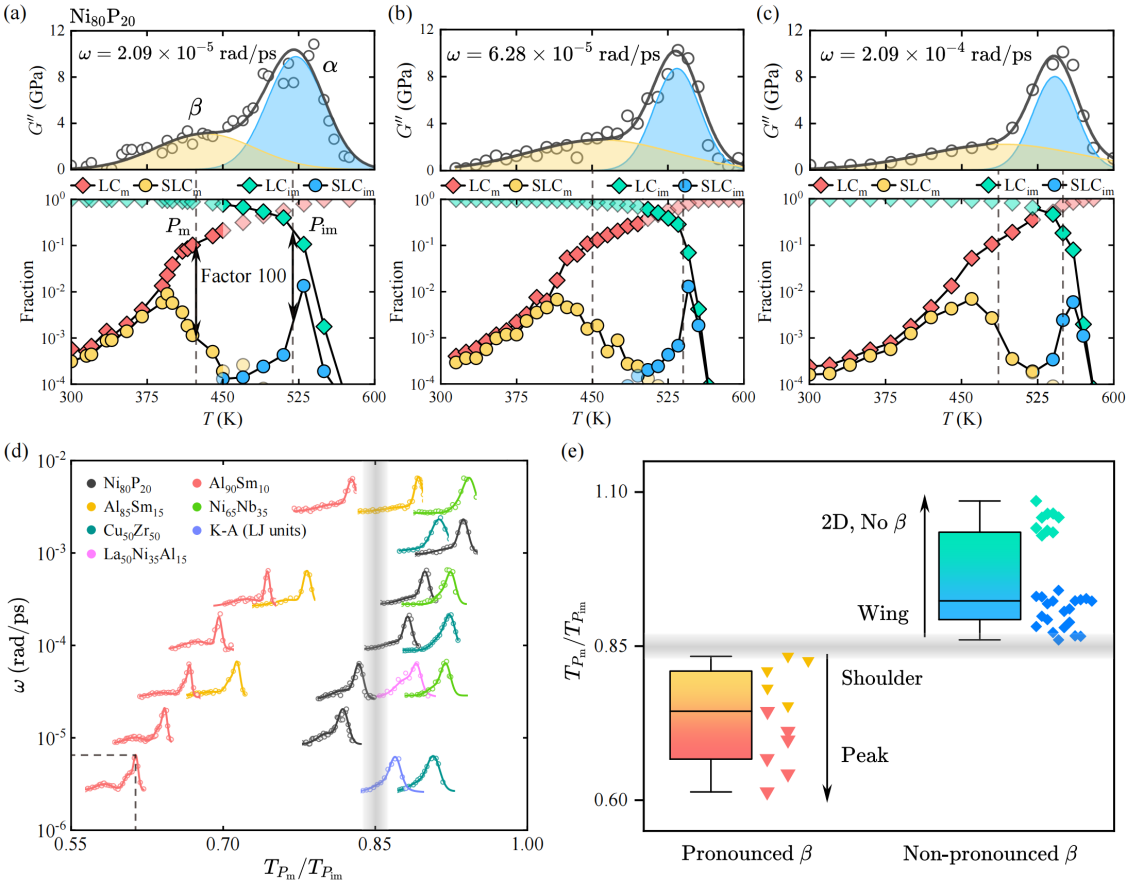 于海滨教授团队提出了一种双重逾渗模型,并通过对二维和三维玻璃模型的广泛计算机模拟,监测微观粒子的运动,建立了不同运动状态粒子的逾渗和a,b弛豫之间的关联(在该模型中,粒子的运动状态是广义的,不被具体的自由度所局限)。如图1所示,随着温度降低至液态,金属玻璃中不可移动粒子(immobile)的逾渗发生在a弛豫温度范围内,而当温度进一步降低至玻璃态时,可动粒子(mobile)的逾渗则界定了b弛豫的发生。即,两种粒子的逾渗可分别作为a弛豫和b弛豫的信号。而在二维系统中,由于不可移动粒子和可移动粒子的逾渗几乎同时发生,导致没有明显的a和b弛豫分离。