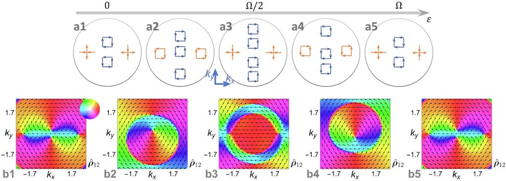 面内自旋图样随谱学能量的演化:(a)涡旋结构示意图;(b)对应的模型计算结果。
