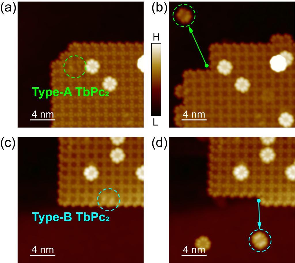 这种畸变完全由分子内部结构调整实现,无需基底参与。实验中,团队通过STM针尖将C2-TbPc₂分子移出分子膜,发现其二重对称性和自旋态仍能保持,进一步证实了电荷态的自稳定性。