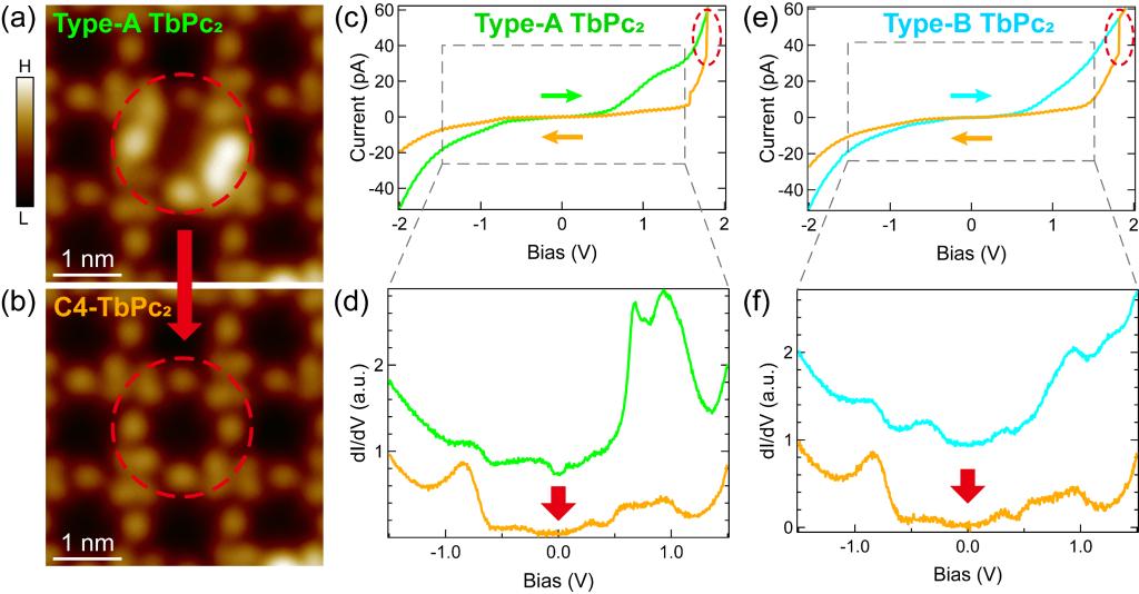 研究的另一关键发现是电荷态的可调控性。通过施加高电压(约1.8 V),团队实现了C2-TbPc₂向C4-TbPc₂的不可逆转变——强电场打破Jahn-Teller畸变,释放多余电子。此外,还能实现B型向A型的转变,为电荷态精准调控奠定基础。这一机制可推广到其他具有内部结构自由度的分子,推动其在自旋电子学和量子技术中的应用。
