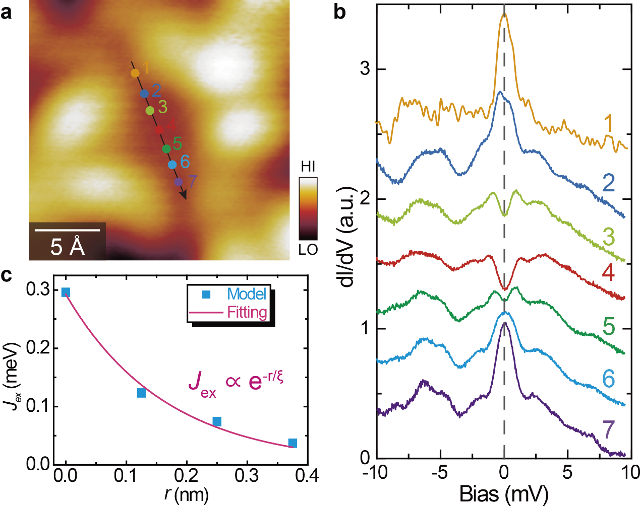 基于以上实验观测,团队的理论合作者发展了广义的Anderson模型和数值重整化群(NRG)方法来描述局域f磁矩与扩展π自旋之间的交换作用。该模型不仅能够解释实验中观察到的近藤共振的空间演变和零场劈裂现象,还为进一步研究单分子磁体中的磁相互作用提供了理论框架。此外,通过理论计算得到的交换耦合强度与实验结果相符,进一步支持了实验结论的可靠性,验证了理论模型的正确性和适用性。该研究在实验上直接探测到了稀土基SMMs中局域的4f电子自旋态,并揭示了其与配体π自由基自旋之间的空间依赖的交换相互作用,实现了对分子磁性的精确控制。这为深入理解单分子磁体中的磁耦合机制提供了重要信息。此外,通过电学手段调控TbPc2分子自旋态和近藤效应的策略,可实现了对分子磁性的精确控制,为量子信息和自旋电子学器件的研发提供了新的思路和方法。
