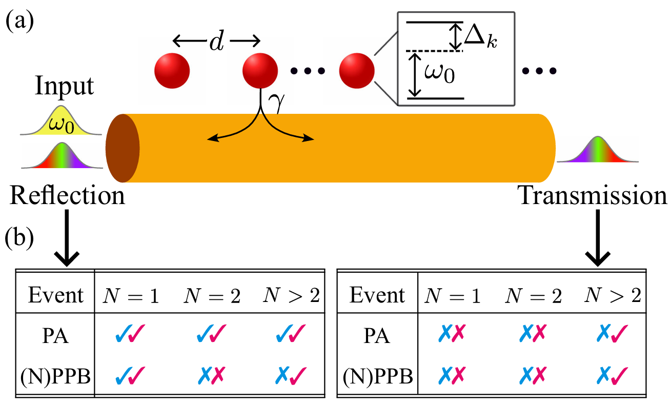 图1.(a)波导QED系统的理论模型。(b)不同原子数对应的强关联光子事件可能性。