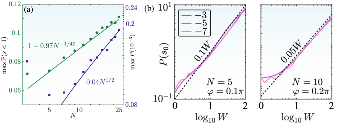 图2.(a)光子反聚束和近完美光子阻塞随原子数的幂律增强。(b)近完美光子阻塞随无序强度的幂律增强。