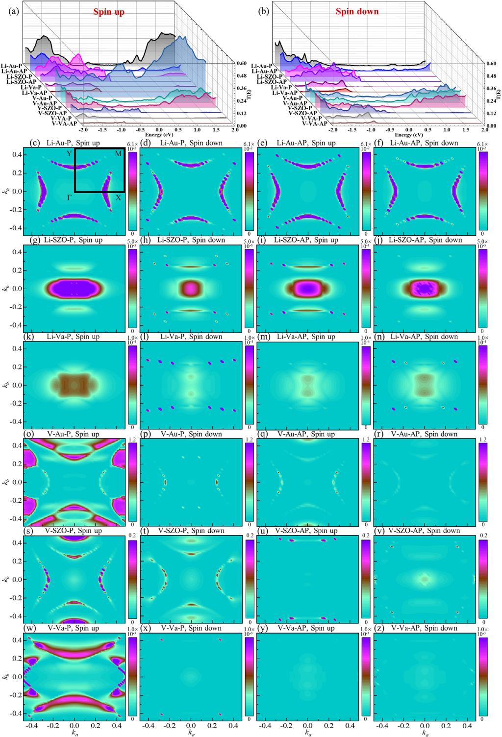 图1.2:基于Li和V插层V2Se2O双层的巨磁阻器件和隧穿磁阻器件的自旋依赖的动量空间的输运系数。