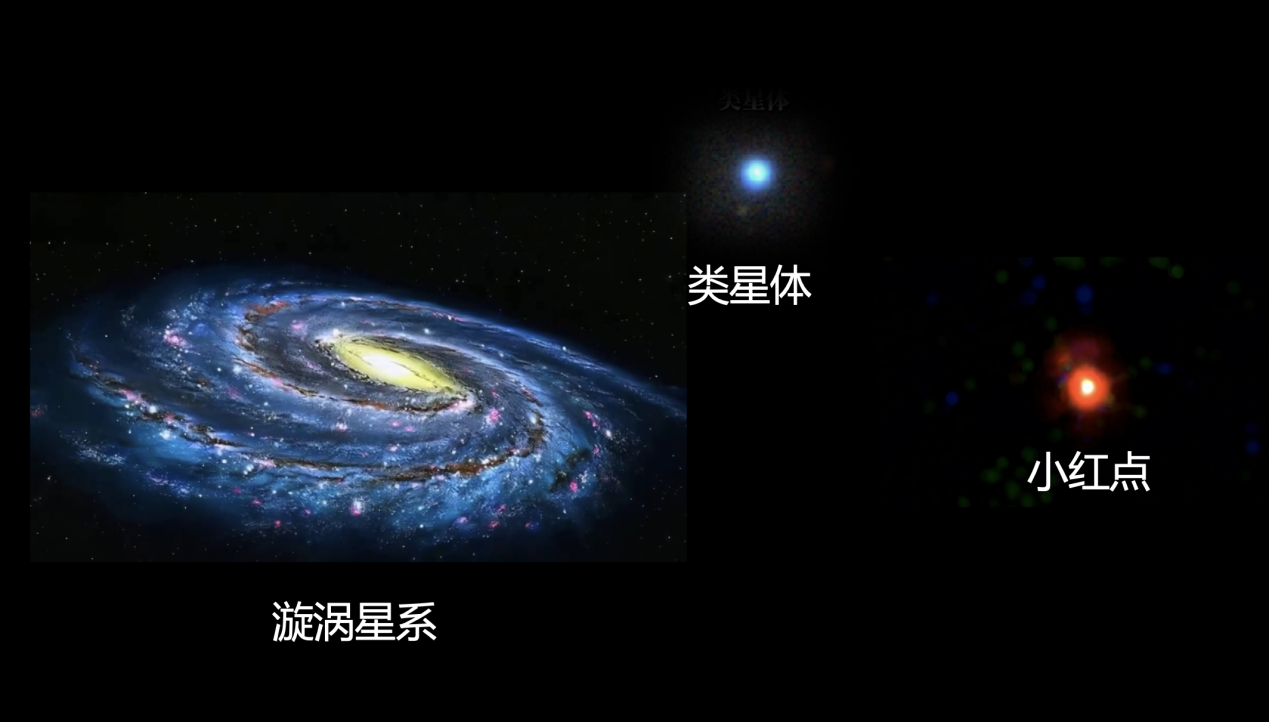 小红点星系极其致密,比普通星系小上千倍。类星体和小红点可能都是超大质量黑洞活动引起,但类星体较蓝而小红点极端偏红。