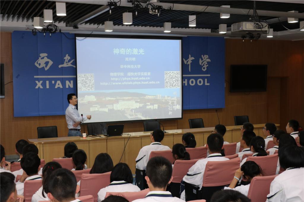 4、2019年4月18日,周月明教授赴陕西省西安83中开展题为《神奇的激光——解读2018年诺贝尔物理学奖》的科普报告。
