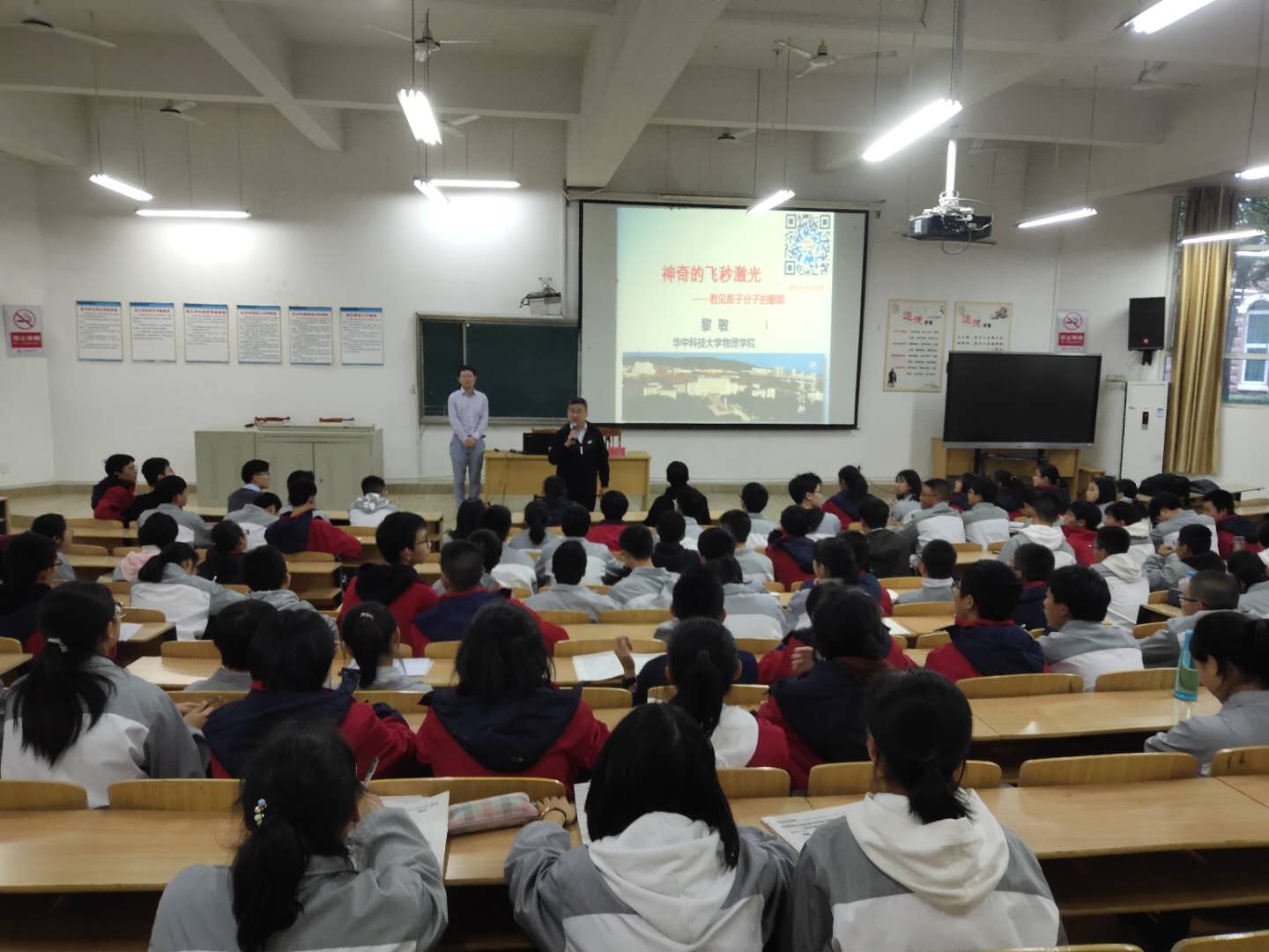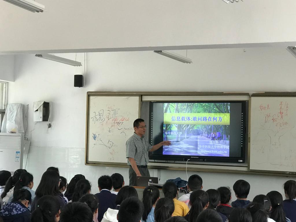 10、2019年5月29日,钱立华教授分赴咸宁嘉鱼一中、赤壁一中开展两场题为《信息载体:敢问路在何方?》的科普报告。