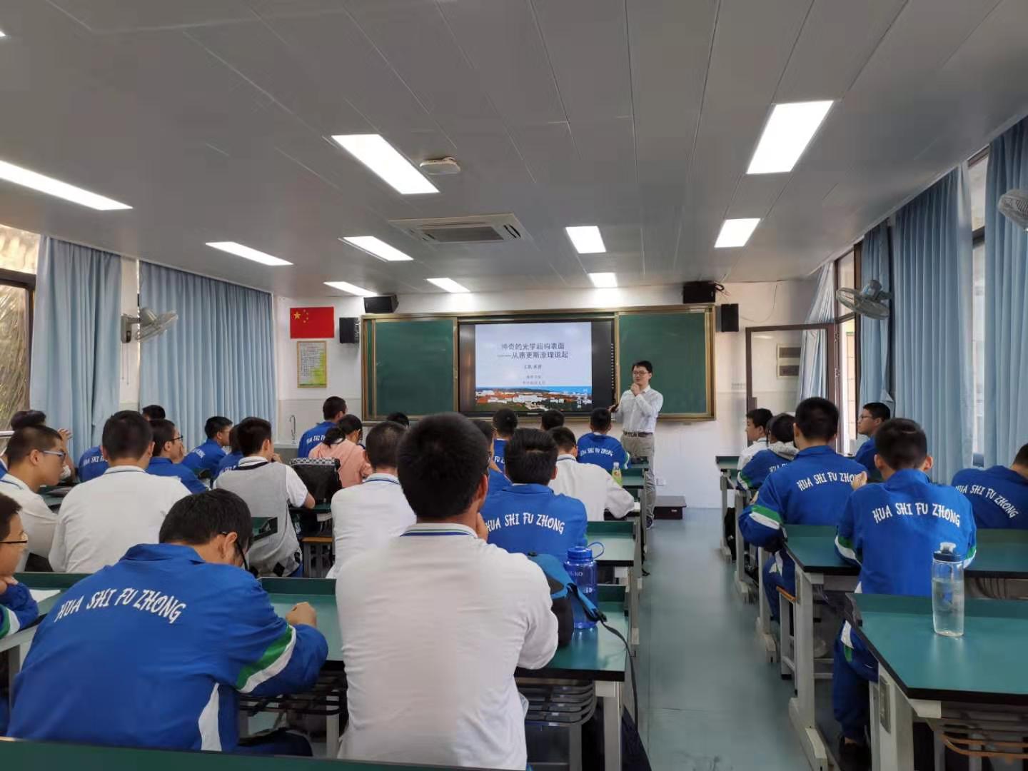 19、2019年11月28日-29日,王凯教授分赴广东顺德一中、华南师大附中开展两场题为《神奇的光学超构表面——从惠更斯原理说起》的科普报告。