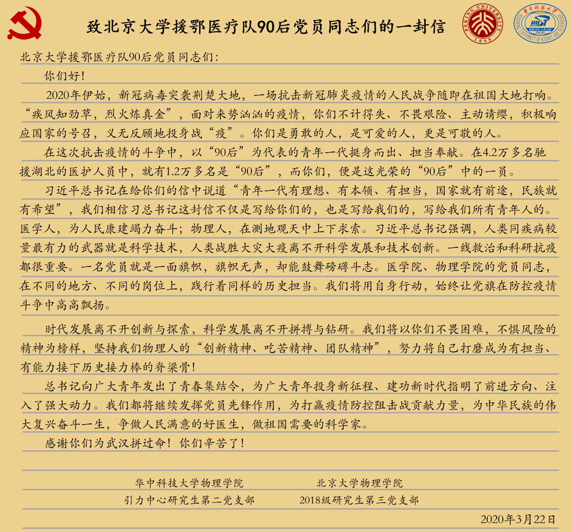 随后,在北京大学2018级研究生第三党支部成员劳怡楠、郭振宁两位同志的带领下,大家共同学习了习近平总书记给北京大学援鄂医疗队全体“90后”党员的回信以及2013年来先后五次给北大师生的回信,进一步了解习近平总书记对每一位青年人、老员工的期望,号召大家爱国、励志、求真、力行,做具有执着信念、优良品德、丰富知识、过硬本领的德智体美劳全面发展的社会主义建设者和接班人。交流学习后,两支部的党员为援鄂医疗队90后党员同志们写了一封信,“医学人,为人民康健竭力奋斗;物理人,在测地观天中上下求索。……我们将以你们不畏困难、不惧风险的精神为榜样,将自己打磨成为有担当、有能力接下历史接力棒的脊梁骨!”
