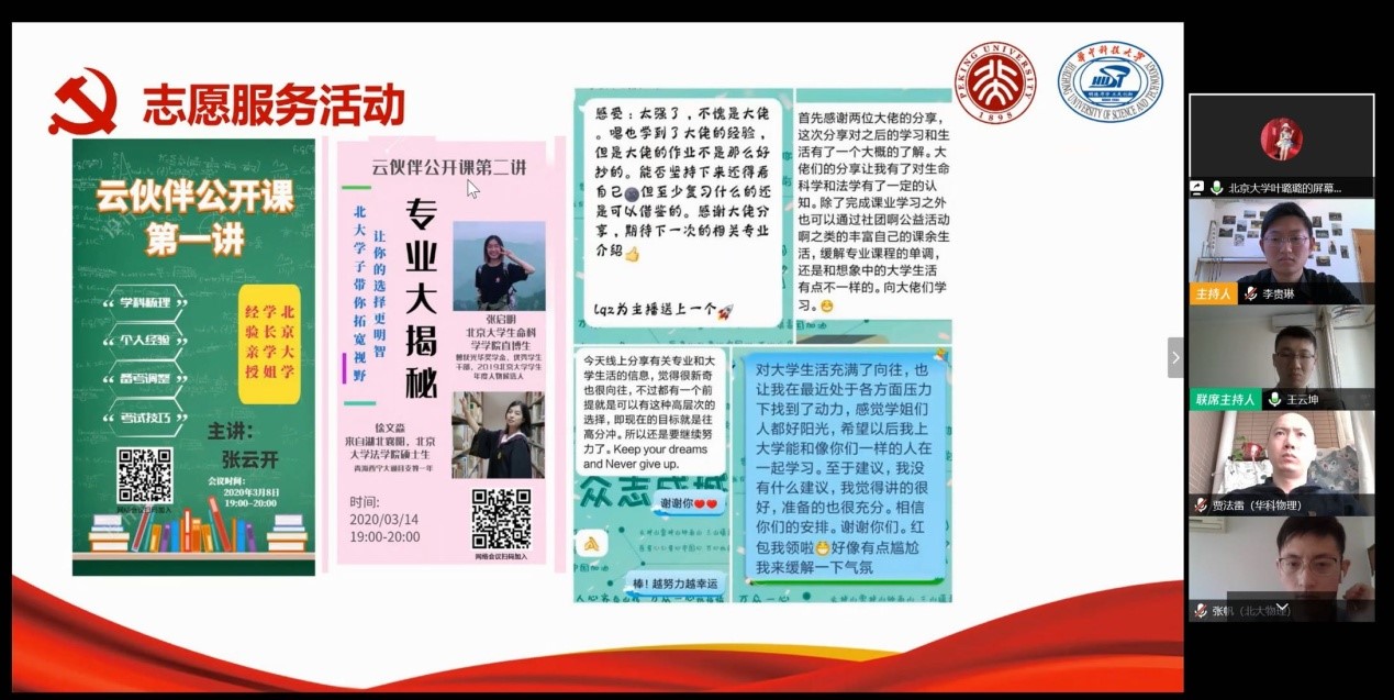 疫情防控战中,除了在前线的医疗队伍,我们物理人也积极参与志愿服务,为战疫队伍贡献青春力量。公司的党员教师们主动请缨参与到校园防疫中,为居住在校内的师生提供服务;北京大学2018级研究生第三党支部叶璐璐同志分享了他们开展面向武汉高中生“云伙伴”一对一帮扶项目的事迹,其他党员同志们也纷纷参与讨论。