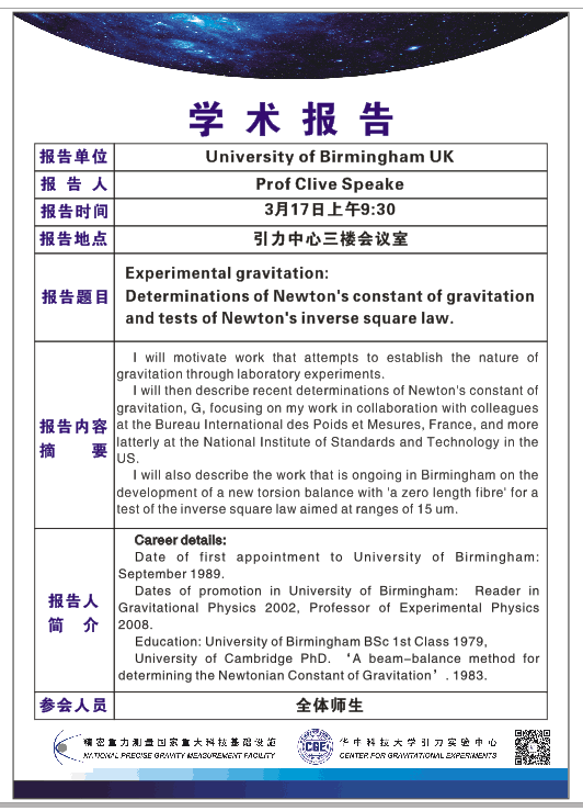 学术报告(20170317)Experimental gravitation: Determinations of Newton’s constant of gravitation and tests of Newton’s inverse square law