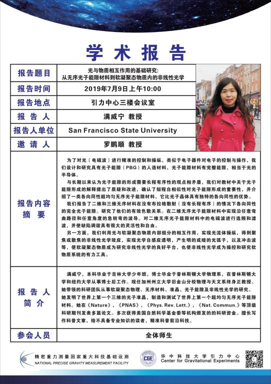 学术报告(20190709)光与物质相互作用的基础研究:从无序光子能隙材料到软凝聚态物质内的非线性光学