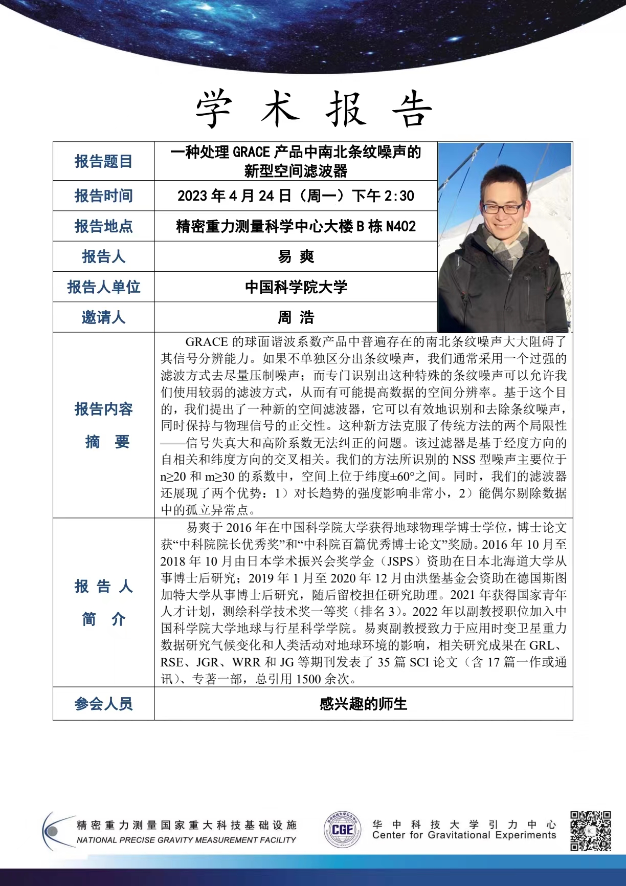 学术报告(20230424)一种处理GRACE产品中南北条纹噪声的新型空间滤波器