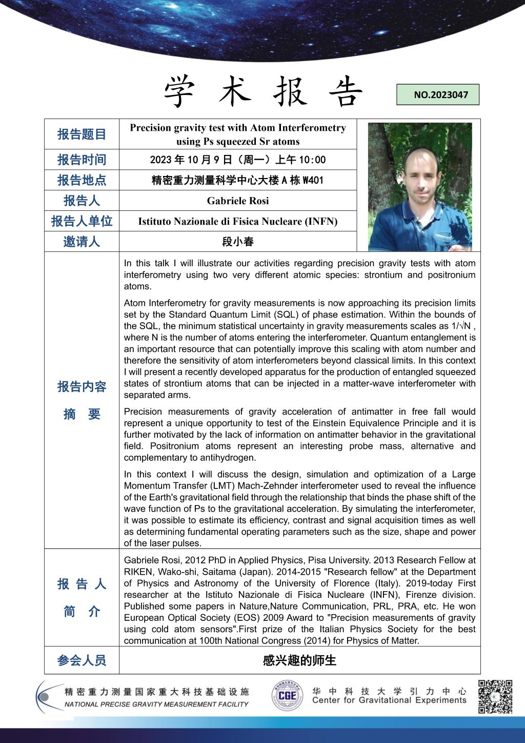 学术报告(20231009)Precision gravity test with Atom Interferometry using Ps squeezed Sr atoms